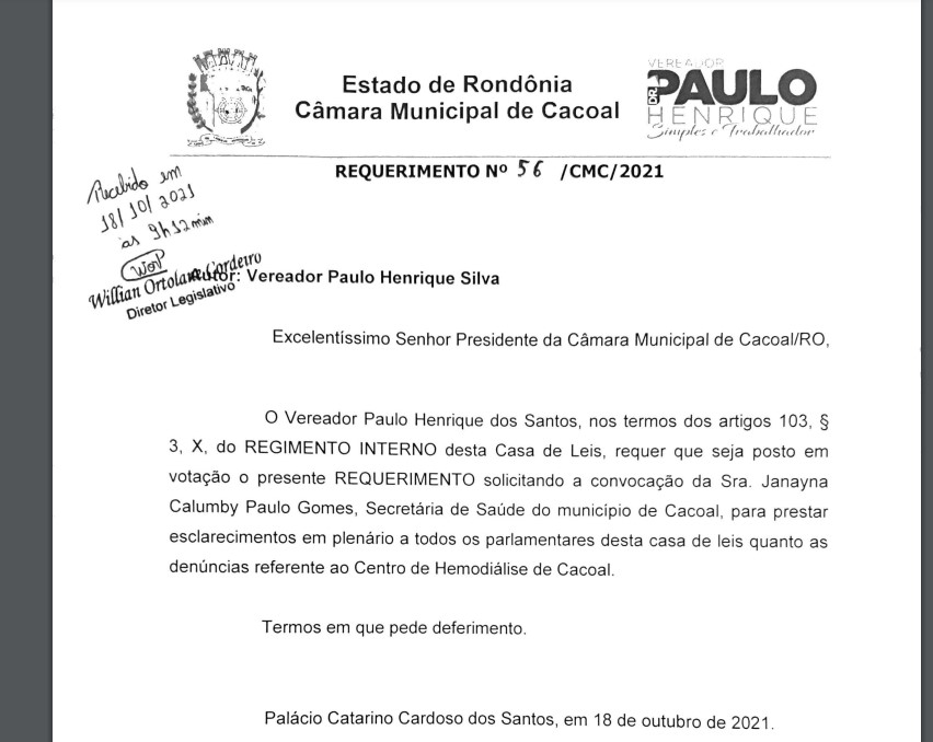Por meio do requerimento 56/CMC/2021, o vereador Paulo Henrique (PTB) quer convocar a secretária municipal de Saúde de Cacoal, Janayna Calumby, para prestar esclarecimentos sobre as denúncias referentes ao Centro de Hemodiálise da cidade, que continua funcionando normalmente, mesmo com as 30 supostas mortes causadas pela água contaminada.