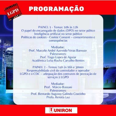 No dia 16 deste mês, no horário das 10h às 16h30, o curso de Direito da UNIRON discutiu de forma virtual a respeito da Lei Geral de Proteção de Dados – LGPD, “Os desafios da implementação da LGPD na Administração pública e no setor privado”.