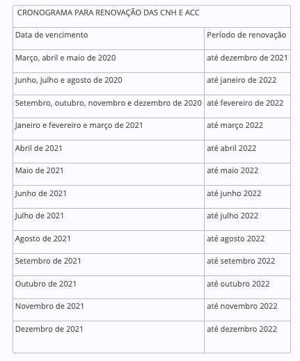 E estabelece novos prazos para renovação das CNH e das Autorização para Conduzir Ciclomotores (ACC) vencidas entre 1º de março de 2020 e 31 de dezembro de 2021, deverá ser observado o cronograma a seguir: