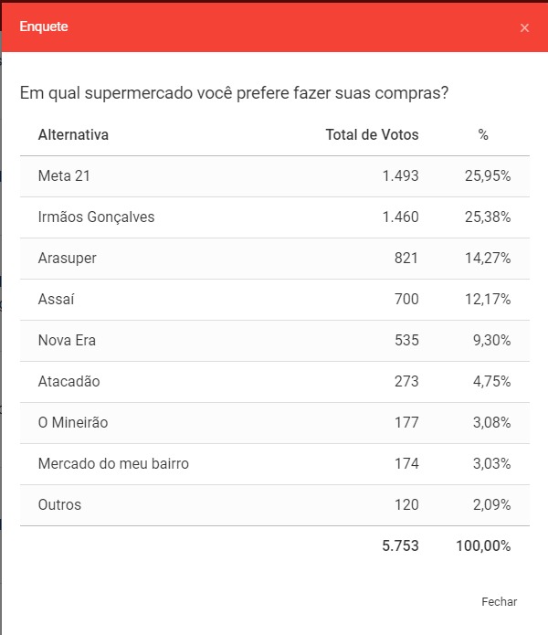 O Rondoniaovivo realizou, recentemente, uma enquete onde procurou saber dos internautas qual supermercado da capital, tinha a preferência deles. O levantamento durou dois dias e foram listados oito locais de compras na cidade.