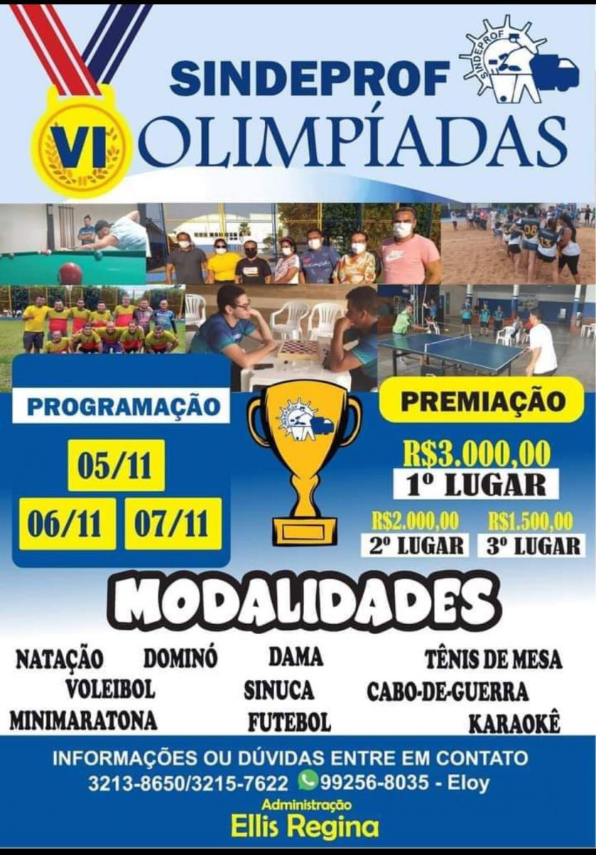 Começam na tarde de sexta-feira 05.11 as Olimpíadas do SINDEPROF – Sindicato dos Servidores Municipais de Porto Velho. A competição reunirá servidores da maioria das secretarias municipais e será disputada nas modalidades do futebol soçaite, voleibol de areia, natação, sinuca, tênis de mesa, dominó, e os tradicionais cabo-de-guerra, Karaokê e a minimaratona que tradicionalmente dá o pontapé inicial dos jogos.