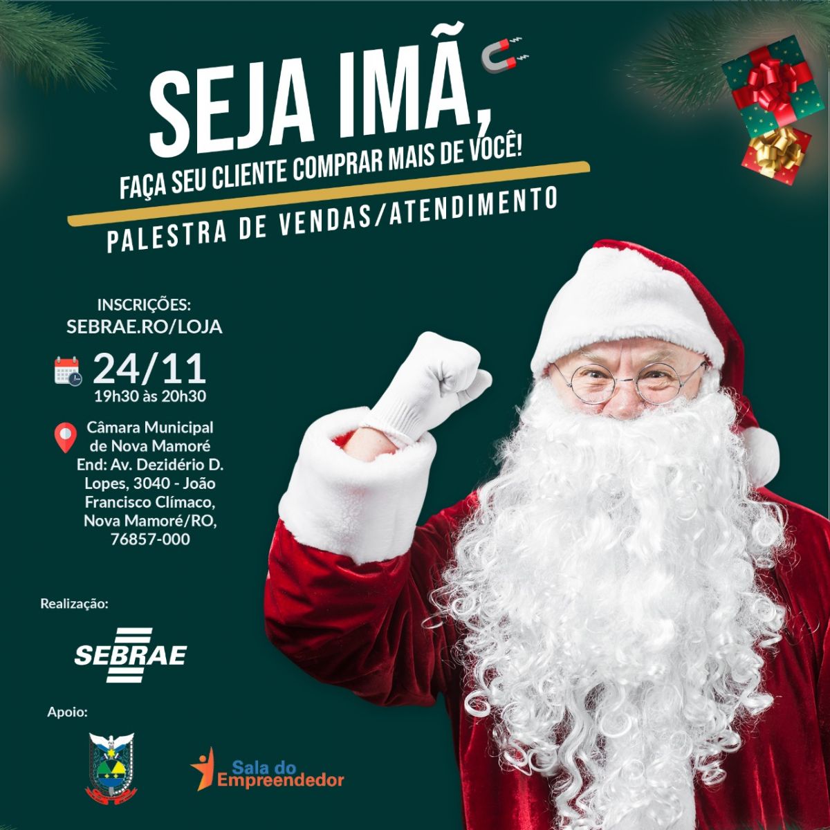 Com o fim de ano chegando, o comércio varejista se prepara para um grande aquecimento nas vendas. Pensando nisso, o Sebrae em Rondônia idealizou a grande palestra “Seja um Ímã - Faça seu cliente comprar mais de você!”, que acontece de maneira presencial em Guajará-Mirim e Nova Mamoré nos dias 23 e 24 (terça e quarta-feira).