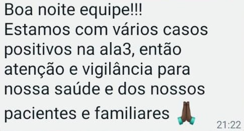 “Boa noite equipe!!! Estamos com vários casos positivos na Ala 3, então atenção e vigilância para nossa saúde e dos nossos pacientes e familiares”, comunicou a supervisora.