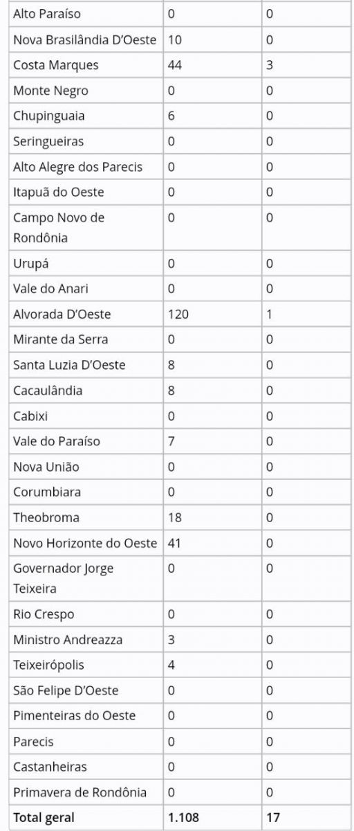 Os municípios em que mais tiveram casos novos, foram: Cacoal, Rolim de Moura, Alvorada D'Oeste, Ji-Paraná e Buritis. Porto Velho não registrou nenhum caso.