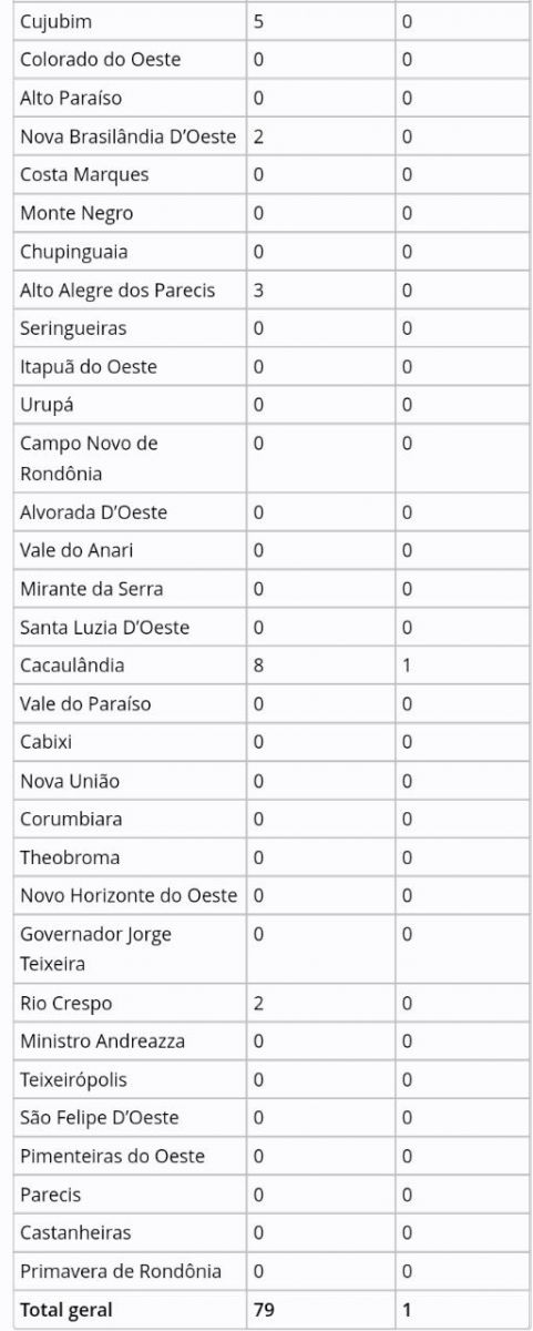 O Estado de Rondônia registrou no último domingo (19), 79 casos e um óbito por covid-19. A vítima era um morador do município de Cacaulândia.