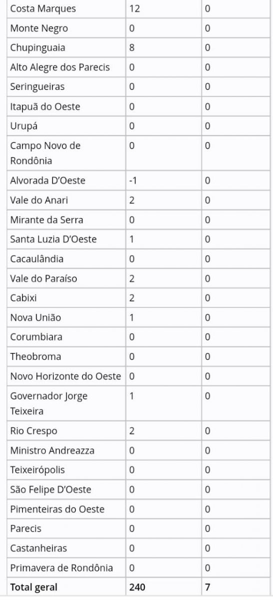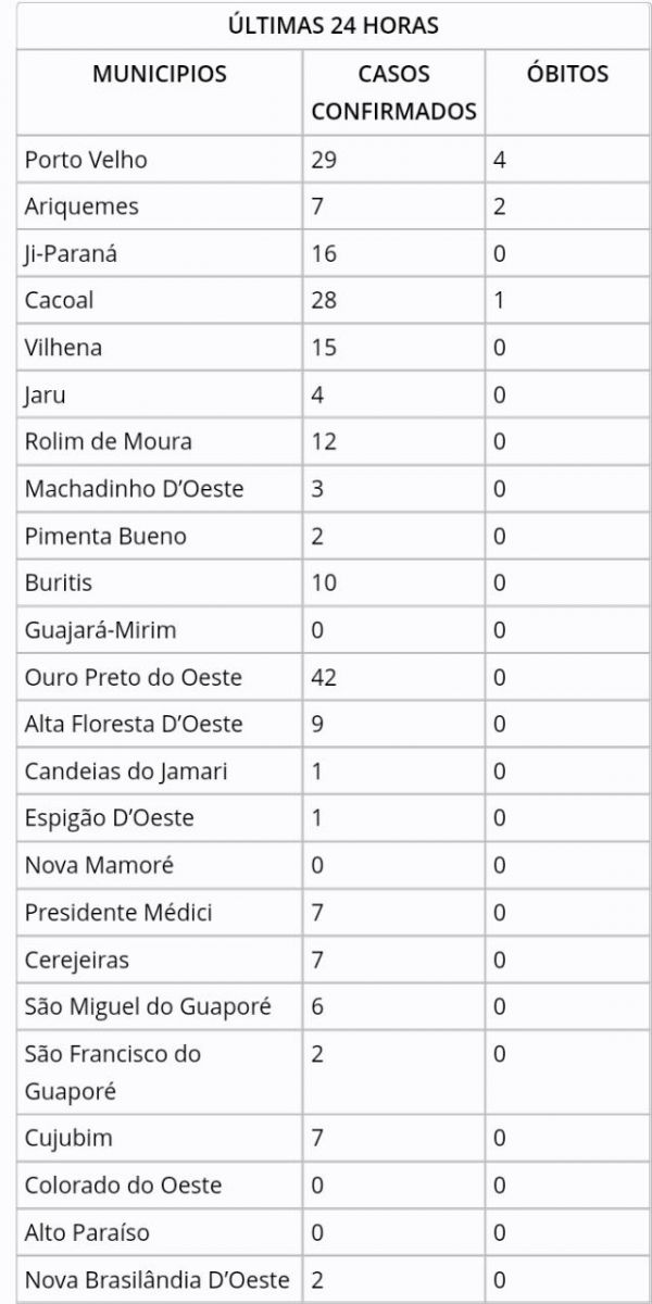 De acordo com o boletim diário, os municípios em que mais tiveram casos novos, foram: Cacoal, Ouro Preto do Oeste e Porto Velho.