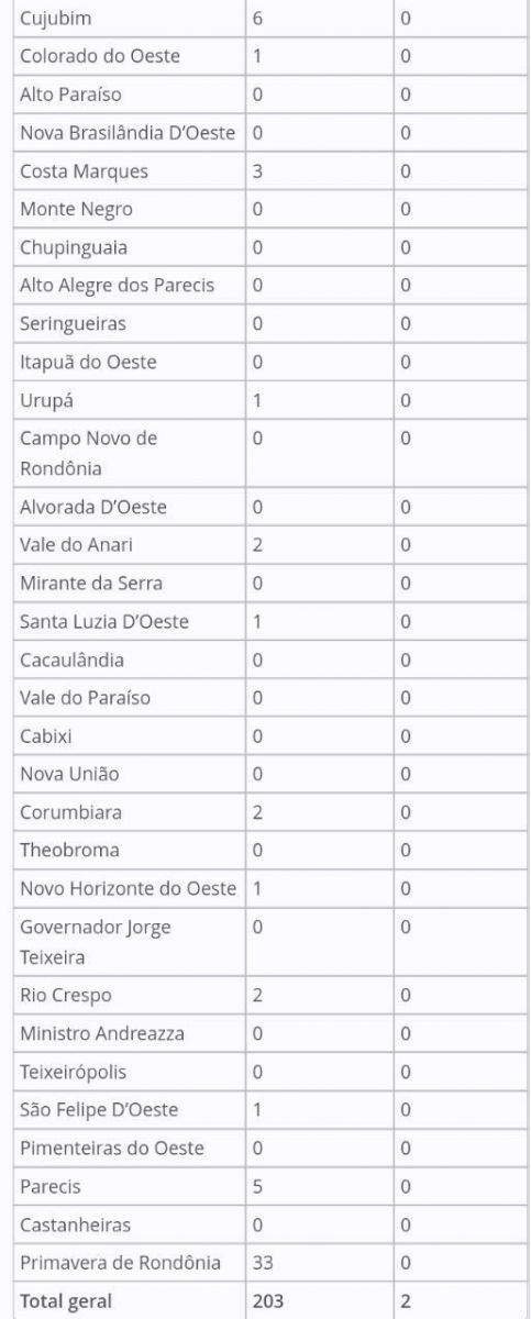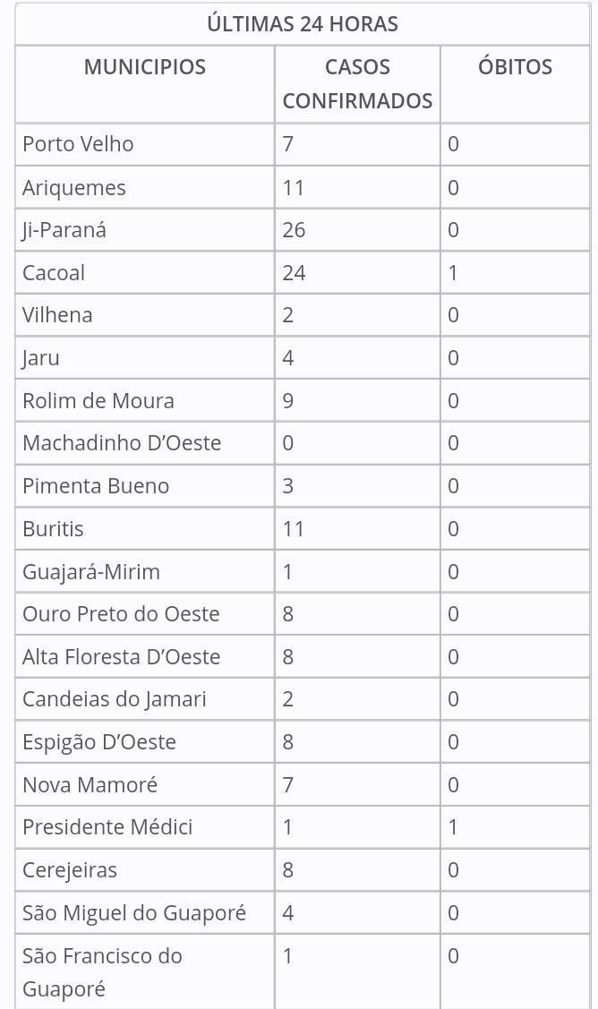 Segundo o boletim diário, os municípios que mais registraram casos novos, foram: Cacoal, Ji-Paraná e Primavera de Rondônia.