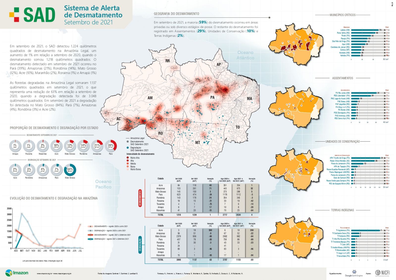 Rondônia e Mato Grosso foram responsáveis, respectivamente, por 54 km² (11%) e 42 km² (9%) do desmatamento registrado na região em novembro. Esses dois estados também possuem cinco das 20 áreas protegidas que mais sofreram com a devastação da floresta, sendo duas unidades de conservação e três terras indígenas. São elas: Esec de Samuel (RO), Resex Jaci Paraná (RO), TI Karipuna (RO), TI Menkü (MT) e TI Rio Guaporé (RO).