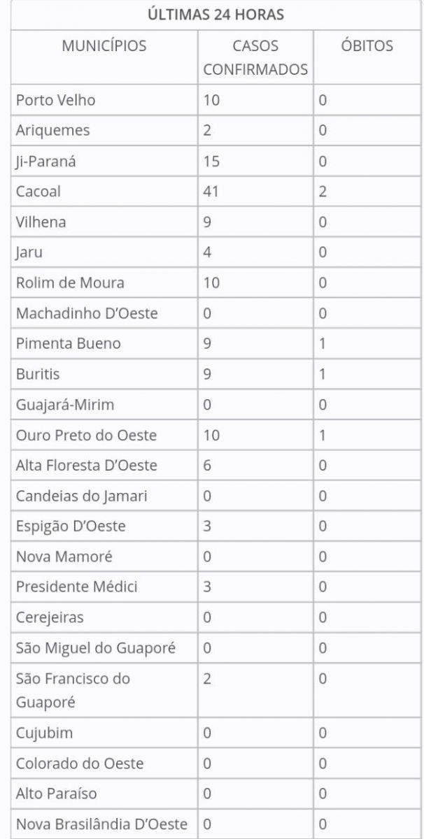Segundo o boletim diário, as cidades em que mais registraram novos casos, foram: Cacoal, Ji-Paraná, Machadinho d'Oeste, Ouro Preto do Oeste, Porto Velho e Rolim de Moura.
