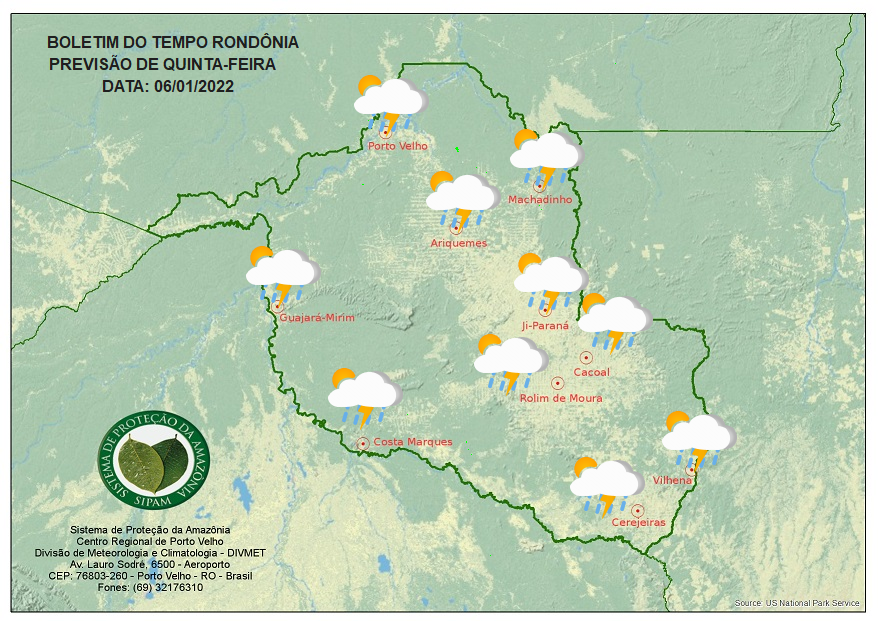 A previsão para este dia é de céu parcialmente nublado a nublado com pancadas de chuva e trovoadas entre a tarde e à noite em todas as regiões rondonienses.