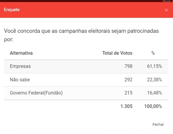 Durante alguns dias, o Rondoniaovivo perguntou aos internautas se eles eram a favor do financiamento de campanhas eleitorais por empresas, pelo Governo Federal (por meio do fundão) ou não sabem o meio mais adequado.