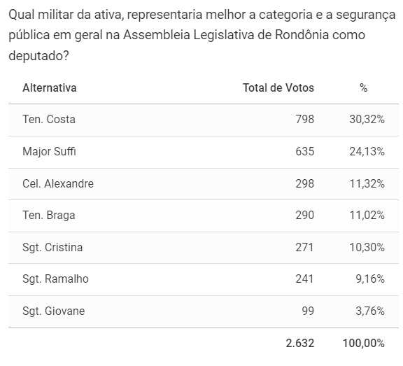 Sete nomes foram cotados e o resultado da enquete, colocou o tentente Costa em primeiro lugar, com 30,32% (798 votos).