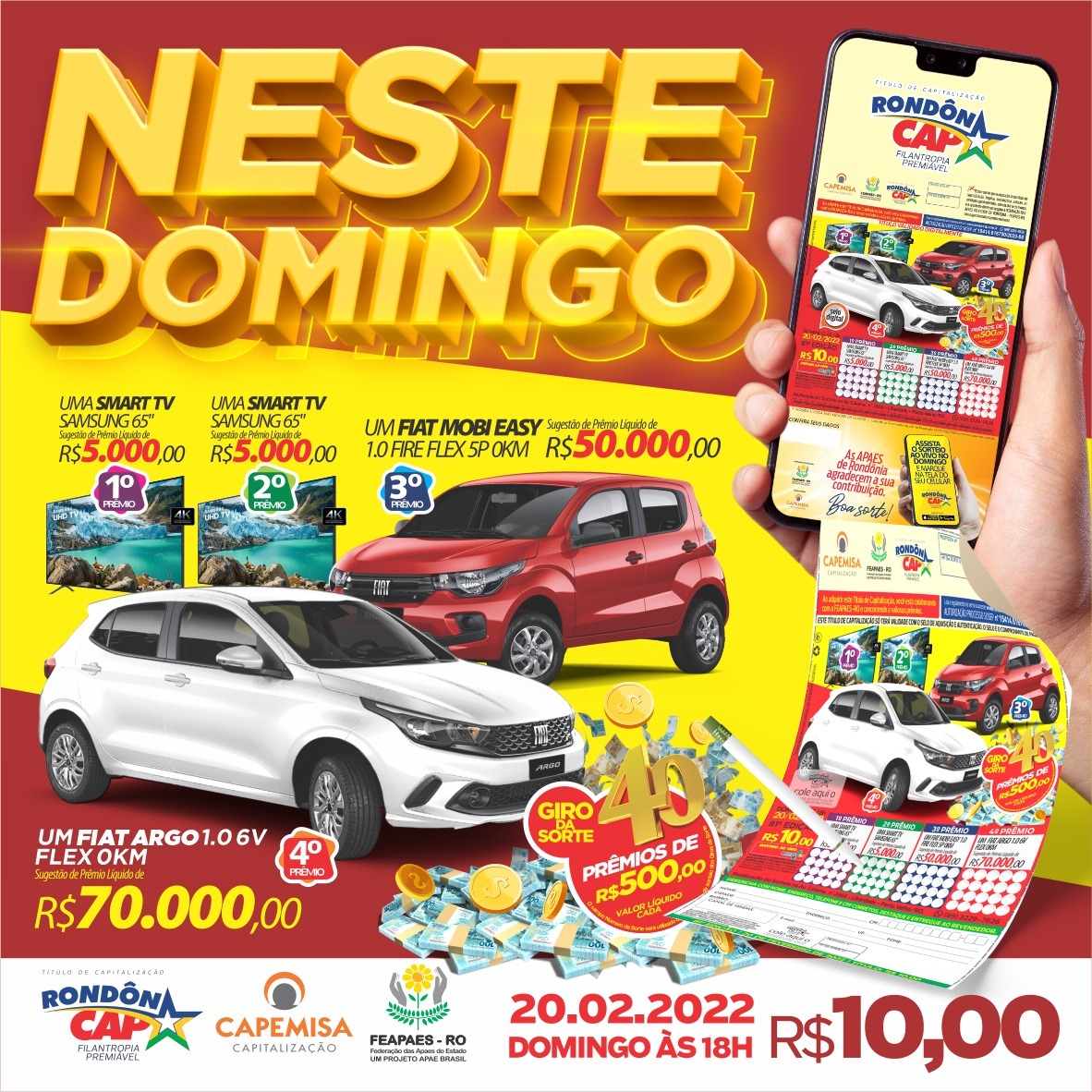 E no próximo domingo, o Rondoncap vai sortear dois carros 0KM e duas tvs de 60 polegadas. Não para por aí, serão sorteados também 40 giros da sorte no valor de R$ 500. Tudo isso por apenas 10 reais!!!