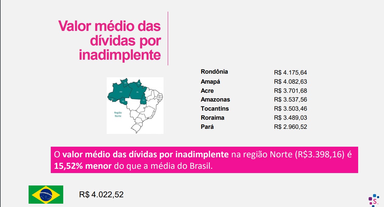 No Norte, 42,09% da população adulta está inadimplente e a soma de todos os débitos atinge a cifra de R$ 18,8 bilhões. O valor médio da dívida por inadimplente é de R$ 3.398,16 – 15,52% menor do que a média nacional.