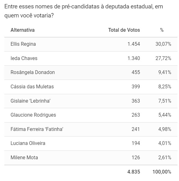 Rondoniaovivo nos últimos dias, onde entre os nomes de pré-candidatas à deputada estadual, em quem o internauta votaria, a primeira colocada foi a vereadora de Porto Velho, Ellis Regina (Podemos). Ela teve 1.454 votos ou 30,07% do total.