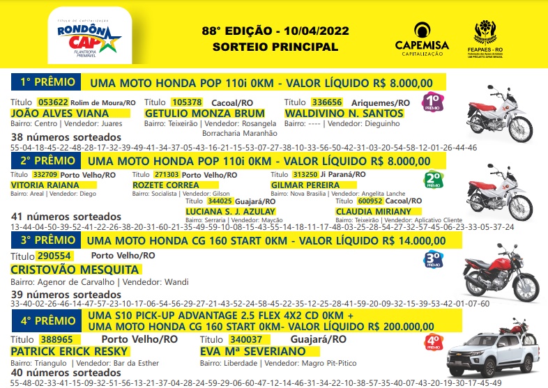 E no próximo domingo (17), tem o Rondoncap especial de Páscoa com diversos prêmios para você. No terceiro e quarto prêmio, tem um Fiat Mobi no valor de 50 mil reais e no primeiro e segundo prêmio uma moto Honda NXR 160 Bros.
