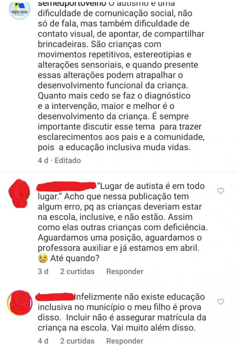 Uma mãe comentou que “Lugar de autista é em todo lugar. Acho que nessa publicação tem algum erro, porque as crianças deveriam estar na escola, e inclusive, não estão. Assim como elas, outras crianças estão com deficiência. Aguardamos uma posição, aguardamos a professora auxiliar e já estamos em abril. Até quando?”.