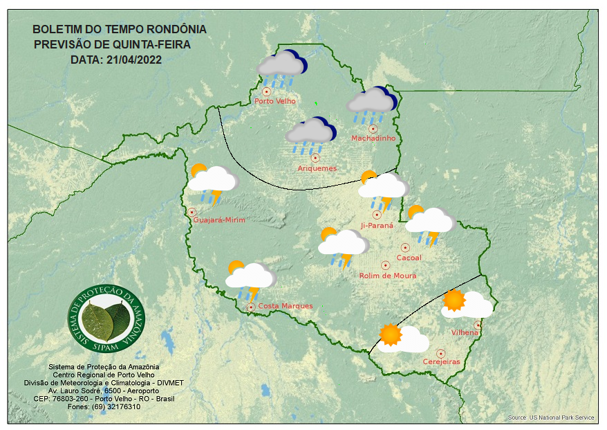 Nas demais regiões rondonienses a previsão é de sol entre nuvens, com tempo variando de parcialmente nublado a nublado e com pancadas isoladas de chuva e trovoadas à tarde.