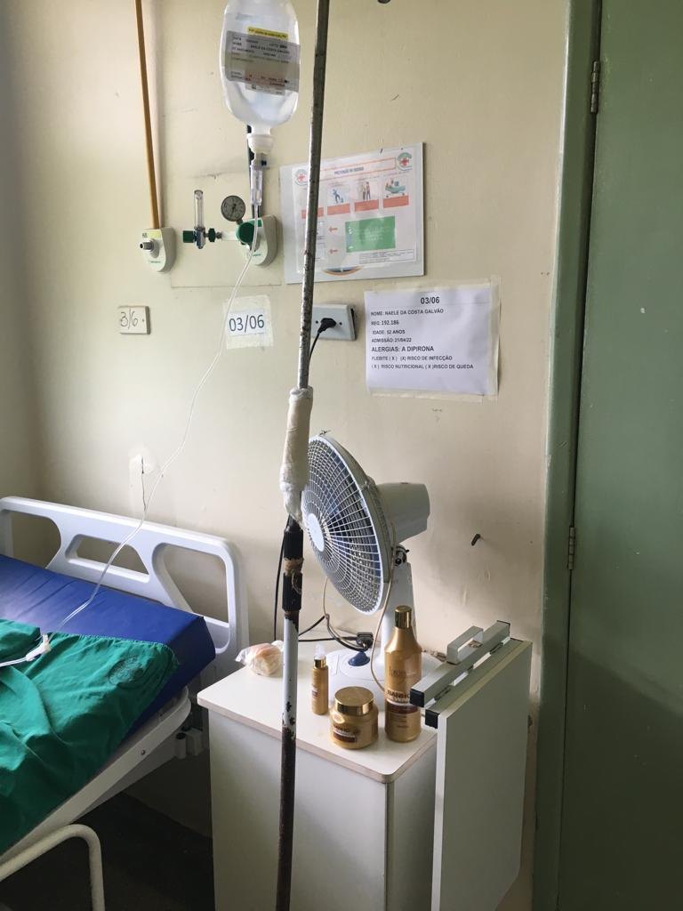 “Olha a situação do hospital Cemetron, na ala feminina, aqui onde minha mãe se encontra. Lembrando que a central [de ar-condicionado] não está funcionando. Não tem água gelada. Com o calor que a gente passa em Porto Velho é um descaso. Olha essas paredes, o ferro [do soro] enferrujado”, afirmou Ana Carolina.