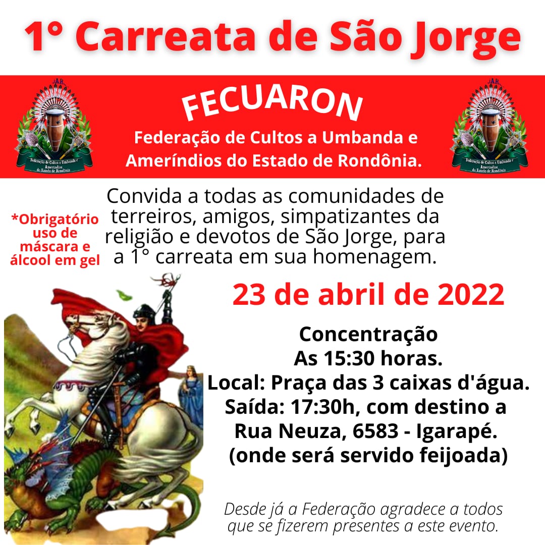 Por isso, a Fecuaron (Federação de Cultos a Umbanda e Ameríndios do Estado de Rondônia) vai realizar a 1ª Carreata de São Jorge com concentração a partir das 15:30 na Praça das Três Caixas D’Água.