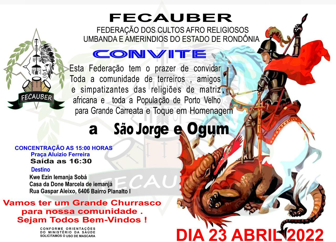 Quem também fará um evento especial para saudar São Jorge é a Fecauber (Federação dos Cultos Afro Religiosos de Umbanda e Ameríndios do Estado de Rondônia), cuja concentração da carreata vai acontecer na Praça Aluízio Ferreira a partir das 15 horas e a saída está prevista para as 16:30.