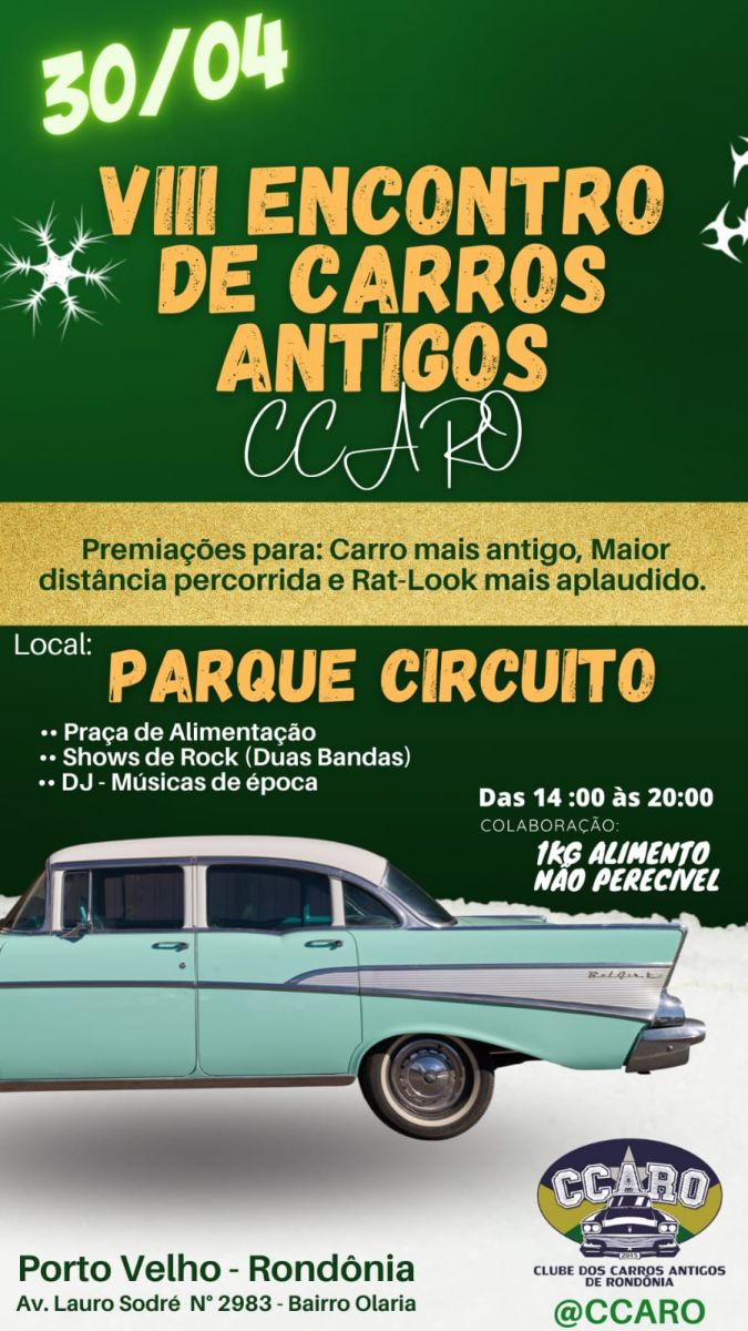 O Clube de Carros Antigos de Rondônia promove neste sábado (30), o VIII Encontro de Carros Antigos do Estado. O evento terá início às 14h e irá até às 20h, no Parque Circuito em Porto Velho.