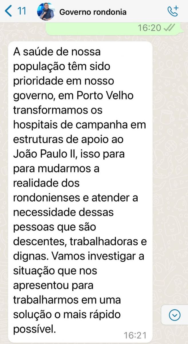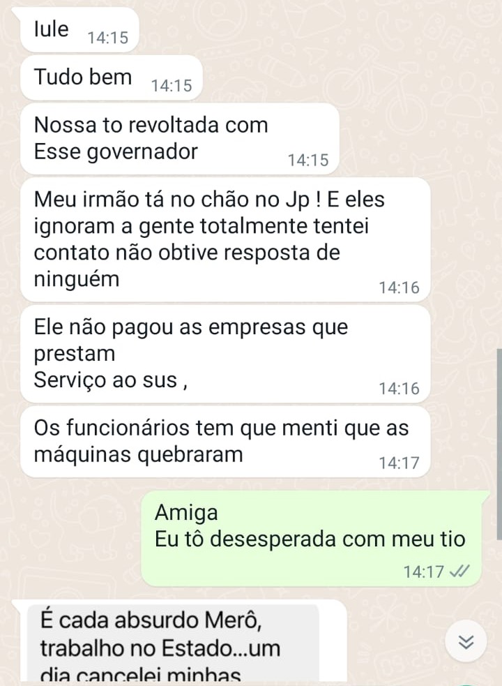 E Merô completa as afirmações: “É verdade. Tenho primos que trabalham na saúde. A menina que cuida da liberação dos exames, ela chora, não sabe o que falar pras pessoas. Mas eles [governo] não pagaram as empresas que prestam serviços. Os funcionários nem podem falar nada. São coagidos a ficarem calados, porquê são perseguidos pelos comissionados”.