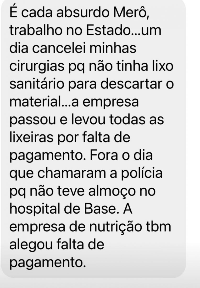 “Trabalho no Estado. Um dia cancelei minhas cirurgias porquê não tinha lixo sanitário para descartar material. A empresa passou e levou todas as lixeiras por falta de pagamento. Fora o dia que chamaram a polícia porquê não teve almoço no Hospital de Base. A empresa de nutrição também alegou falta de pagamento”.