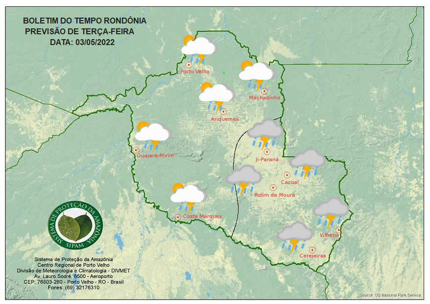 A previsão para esta terça-feira é de sol forte e calor, com tempo variando de parcialmente nublado a nublado e com pancadas isoladas de chuva e trovoadas no período da tarde nas regiões da capital, do Vale do Jamari, do Vale do Guaporé, no Baixo Madeira, na Ponta do Abunã e no nordeste do estado.