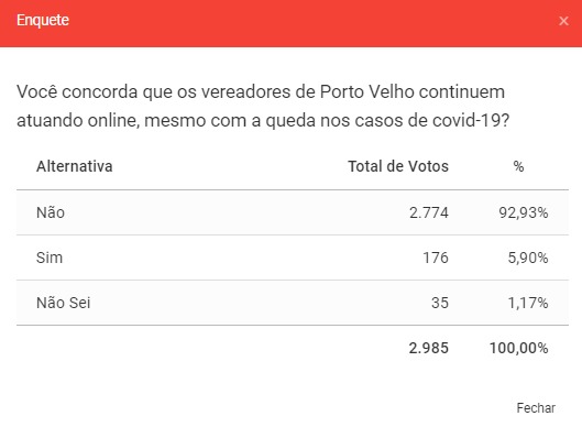 Logo depois de vereadores de Porto Velho reclamarem publicamente da ausência sistemática de colegas nas sessões presenciais ou online da Câmara, o Rondoniaovivo fez uma enquete para saber dos internautas se os parlamentares deveriam continuar atuando de maneira virtual, mesmo com a queda nos casos de Covid-19.