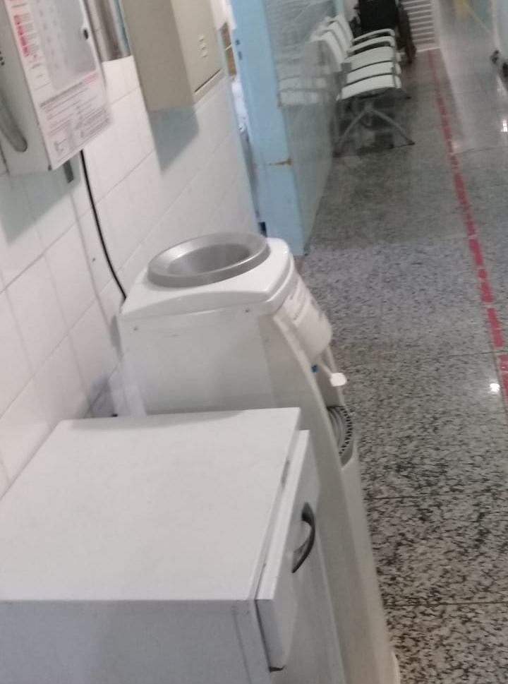 “O hospital inteiro [está] sem água. Nós precisamos de água”, diz uma paciente com um copo na frente do bebedouro.