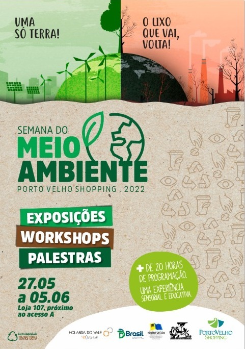 A partir desta sexta-feira (27), o Porto Velho Shopping irá sediar a Semana do Meio Ambiente, com programação até o dia 5 de junho de 2022. O evento, realizado em parceria com a Secretaria Municipal de Meio Ambiente (Sema), contará com área de exposição, workshops, oficinas e palestras em um espaço no Acesso A.