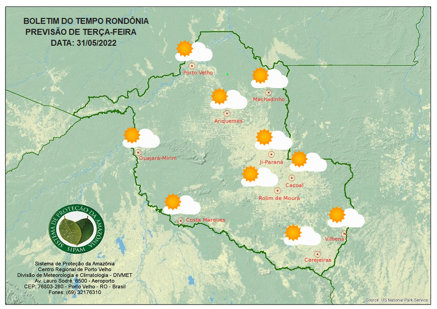 A Divisão de Meteorologia do Sistema de Proteção da Amazônia (Sipam) informa que dia de sol forte e calor em toda Rondônia nesta terça-feira (31), por conta do predomínio do ar quente e seco em grande parte do Estado.