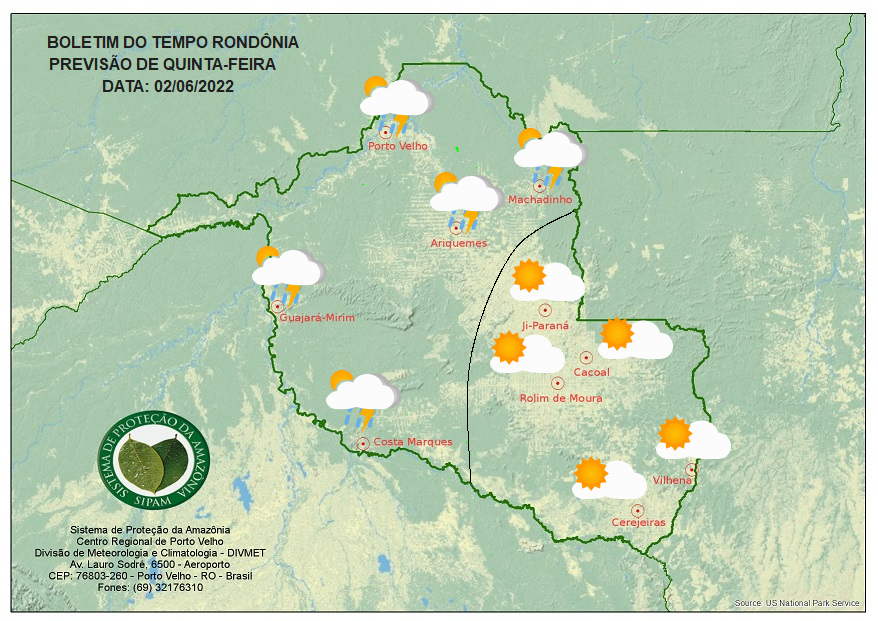 Em Porto Velho existe a possibilidade de chuvas, devido a umidade vinda do Amazonas