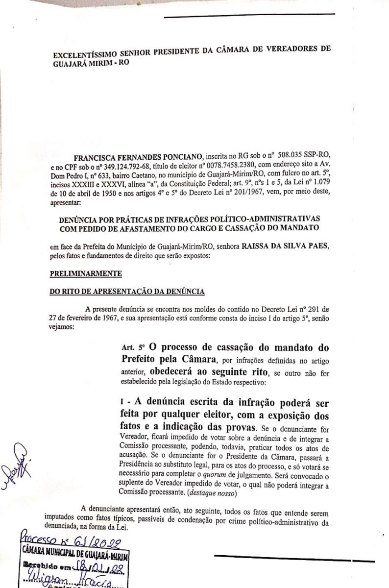 Em fevereiro desse ano, a própria Câmara de Vereadores recebeu um pedido de destituição de Raíssa Paes, que foi rejeitado pelos parlamentares. Os requerimentos feitos por dois moradores de Guajará-Mirim apontavam irregularidades na saúde (que teve oito secretários, incluindo um que estava usando tornozeleira eletrônica) e a falta de investimentos de R$ 2 milhões e 200 mil.