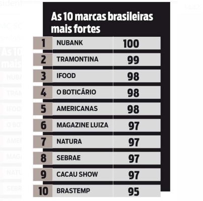 A comparação foi realizada com empresas cujas marcas tradicionalmente são muito fortes, como bancos, cervejarias e redes varejistas.