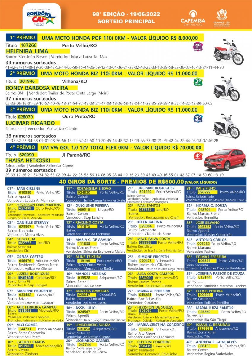 Quem ganha no Rondôncap todo mundo vê, conheça agora os ganhadores do último domingo: