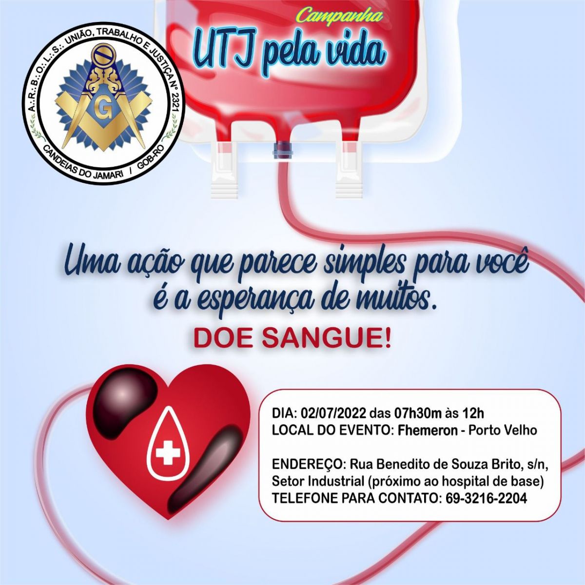 E justamente pelos estoques baixos e críticos, a Loja Maçônica União, Trabalho e Justiça, de Candeias do Jamari, vai realizar uma campanha de doações de sangue na Fhemeron em Porto Velho, no próximo sábado (02), das 07:30 ao meio-dia.