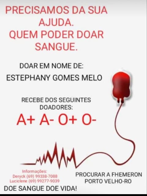 Mais informações sobre o pedido para Estephany podem ser obtidas pelos números (69) 99338-7088 (com Deryck) ou (69) 99277-9039 (Lucilene).