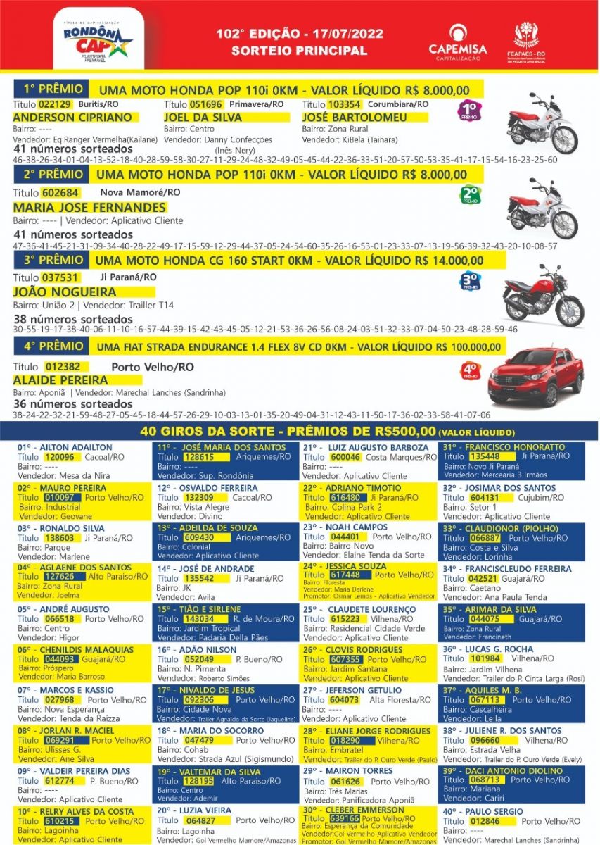 E no próximo domingo o Rondoncap deste domingo vai sortear um carro e uma moto juntinhos e o título é só 10 reais! No quarto prêmio tem um HB20 junto com uma Honda Pop no valor total de 80.000 reais! É o conforto de um carro zero e a economia de uma moto nova para você ter na garagem, ou o valor líquido de 80.000 reais em dinheiro para gastar como quiser! E mais uma Honda Biz no terceiro prêmio, uma TV de 55 polegadas no segundo, outra TV de 55 polegadas no primeiro prêmio e 40 giros da sorte de 500 reais cada.