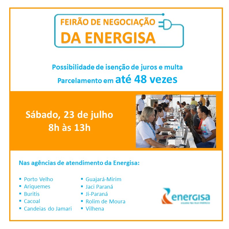 Devido ao grande sucesso do Feirão de Negociação realizado pela Energisa no início do mês na capital, onde de cada dez clientes, nove aproveitaram as condições e negociaram as dívidas, a empresa vai repetir a ação neste sábado, dia 23, em Porto Velho, e em mais nove cidades do interior: Ariquemes, Buritis, Cacoal, Candeias do Jamari, Guajará-Mirim, Jaci-Paraná, Ji-Paraná, Rolim de Moura e Vilhena.