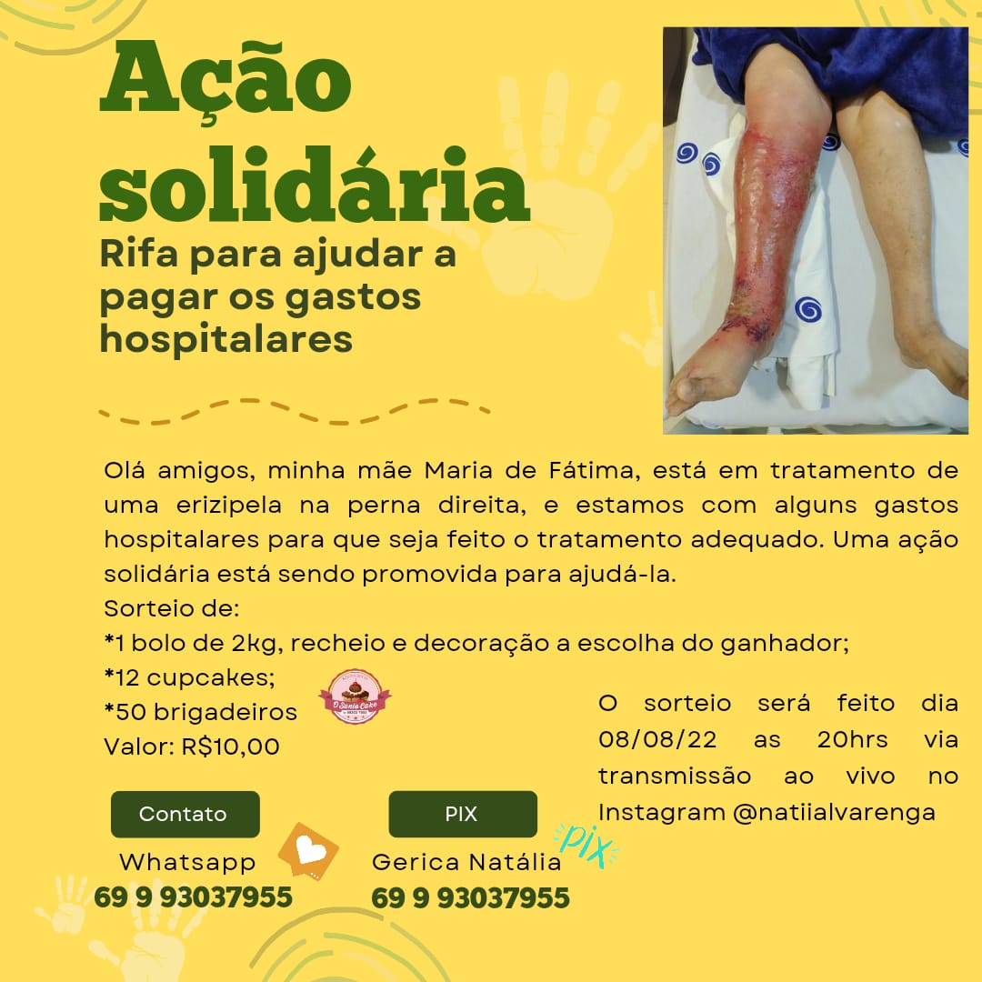 Mais uma ação solidaria está sendo realizada em Porto Velho. Desta vez é para auxiliar no tratamento da senhora Maria de Fatima Caldeira, 63 anos que está com Erizipela na perna direita.