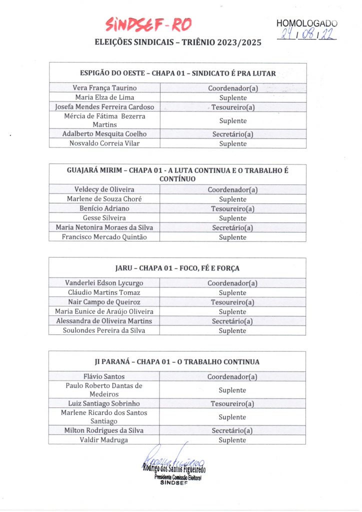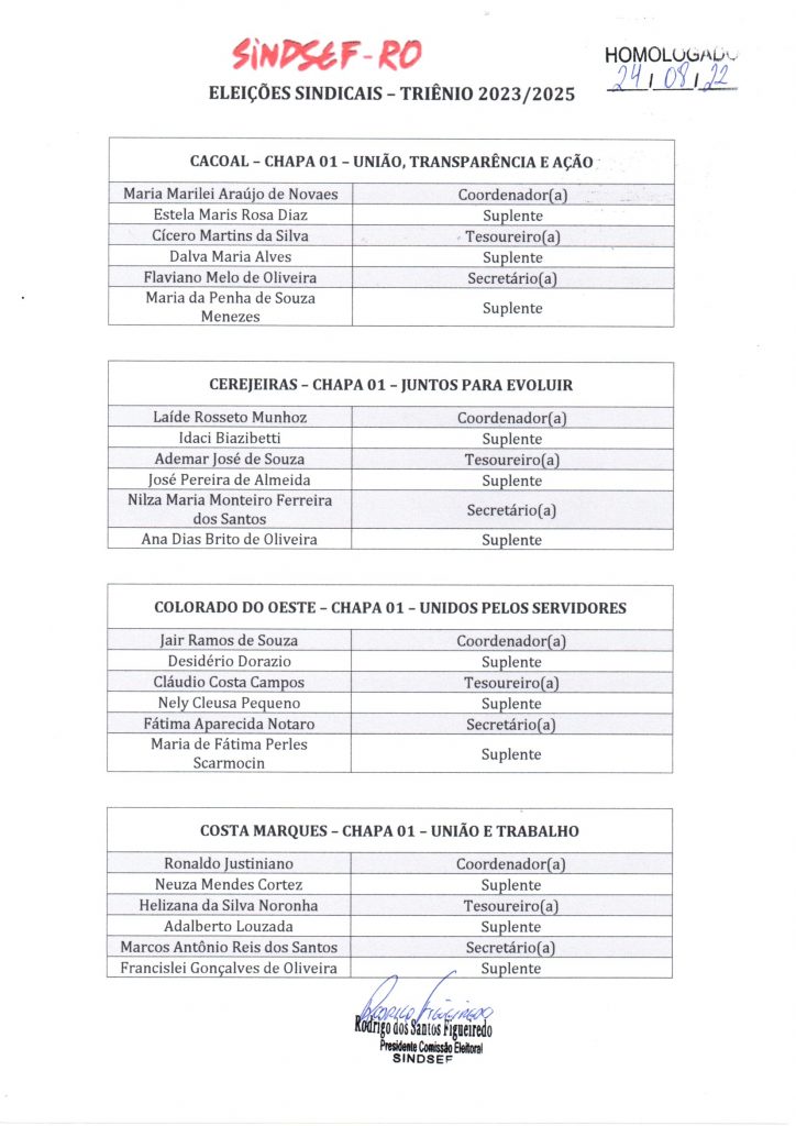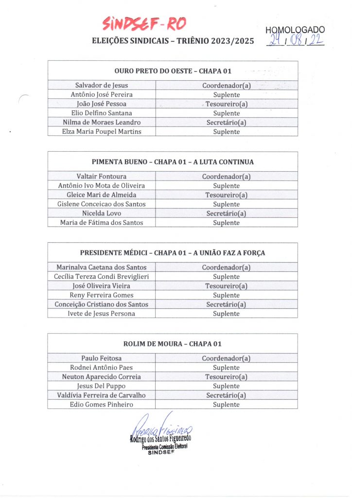 Encerrado o prazo para registro de chapas, análise e homologação, a Comissão Eleitoral informa que a Eleição do Sindicato dos Servidores Públicos Federais no Estado de Rondônia - Sindsef/RO para o triênio 2023/2025 teve chapa única para Diretoria Executiva, Conselho Fiscal e em 19 Coordenações Regionais. Apenas em Machadinho do Oeste terá votação presencial para escolha das chapas concorrentes, a ser realizada no dia 30 de setembro.