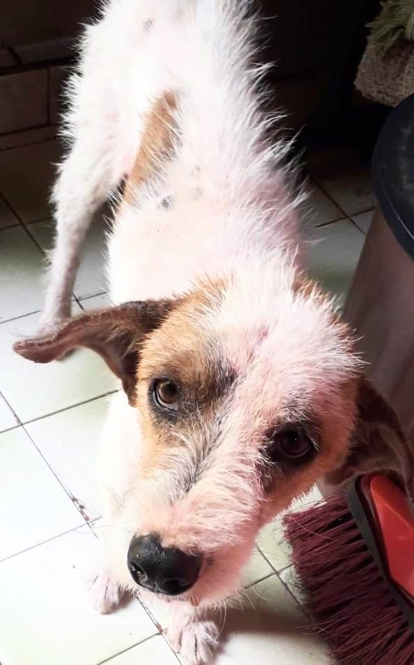 Carequinha foi resgatado recentemente com sarna crônica e ferimentos pelo corpo; Tratamento foi caro, mas o cão já está com aspecto bem melhor