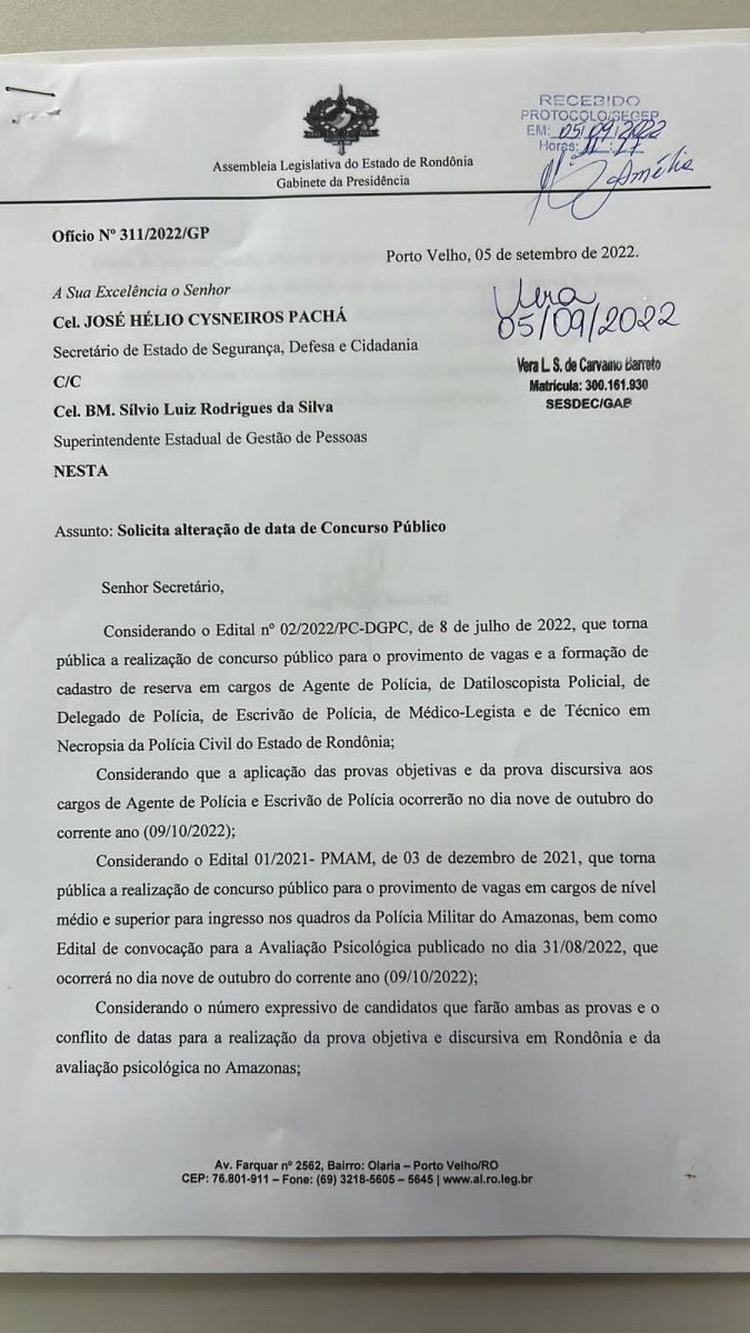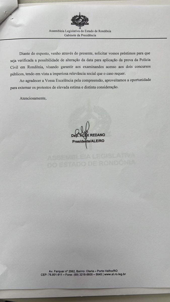 A Assembleia Legislativa de Rondônia, por meio de seu presidente Alex Redano (Republicanos), pediu à Secretaria Estadual de Segurança Pública (Sesdec), nesta segunda-feira (05), a mudança da data do concurso da Polícia Civil.