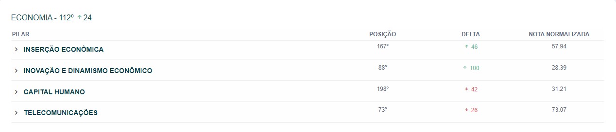 Já em sociedade, os dados são preocupantes, com índices em vermelho em todos os subquesitos: qualidade da saúde caiu 117 colocações (hoje em 317ª), meio ambiente (queda de 67 posições (em 311º) e saneamento (baixa de 39 lugares, ficando em 401º), entre outros.