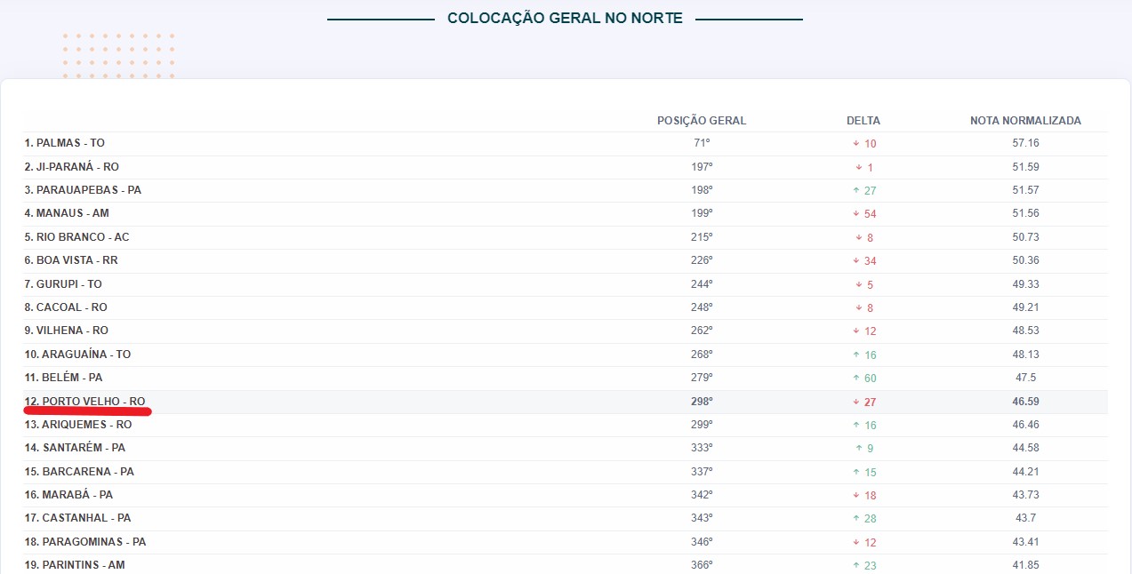 Na nova tabela, a capital de Rondônia aparece atrás de cidades como Palmas (TO), Ji-Paraná, Parauapebas (PA), Manaus (AM), Rio Branco (AC), Boa Vista (RR), Cacoal e Vilhena.