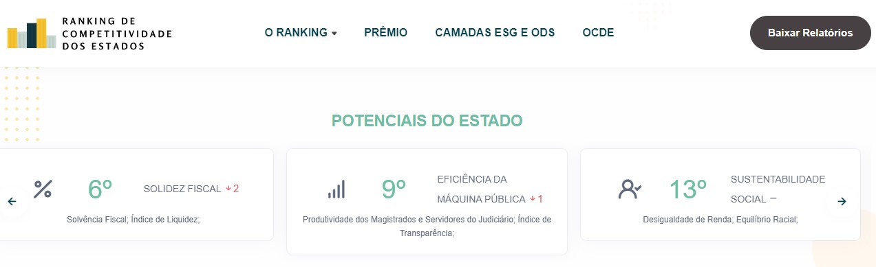 Os potenciais destacados pela pesquisa são solidez fiscal (6º lugar, com queda de duas posições), eficiência da máquina pública (produtividade dos magistrados e servidores do judiciário, além do índice de transparência – na 9ª colocação, com queda de uma), sustentabilidade social (desigualdade de renda e equilíbrio racial - 13ª posição), entre outras.