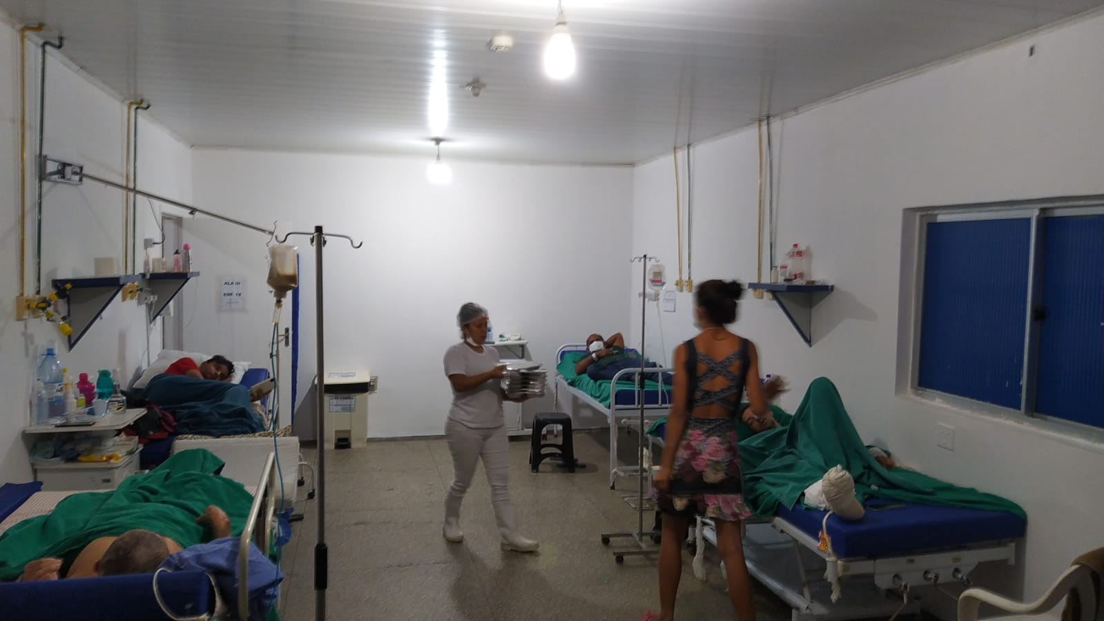 “Um dos rapazes viu que eu estava filmando e fechou a porta. Já falei para eles que estou inalando poeira, passando mal e nem ligam. Eu estou no corredor com outras pessoas e eles estão aí, lixando do nosso lado. Não tiraram ninguém daqui. Mesmo com a porta fechada, a poeira passa por baixo”, disse uma terceira paciente.