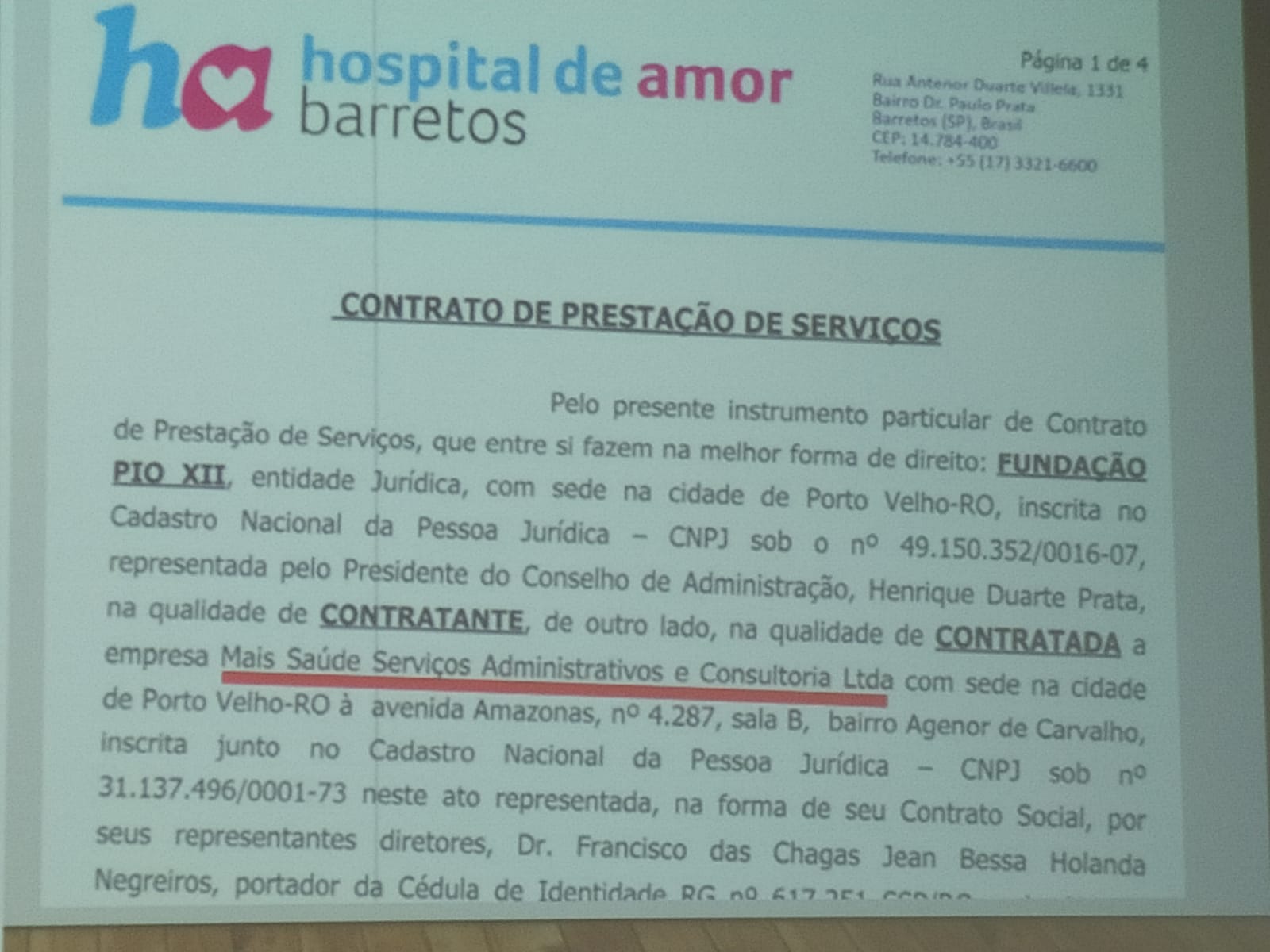 A imagem 04 também mostrou um contrato feito em uma espécie de terceirização dos serviços do Hospital do Amor com uma empresa particular da capital.